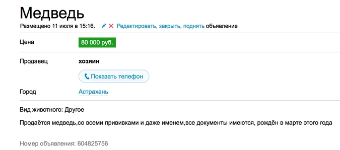 Мужчина решил избавиться от подаренного ему друзьями медвежонка, поскольку не смог его содержать. Тогда он выставил его на продажу через интернет по цене 80 тысяч рублей.
