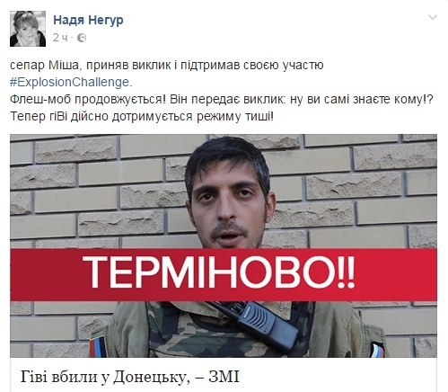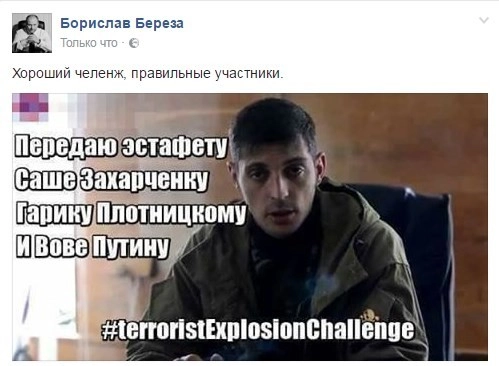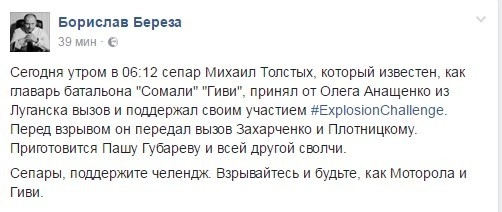 «Главарь батальона „Сомали“ Гиви принял от Олега Анащенко из Луганска вызов и поддержал своим участием #ExplosionChallenge. Перед взрывом он передал вызов Захарченко и Плотницкому. Приготовиться Паше Губареву и всей другой сволочи», — написал украинский депутат Борислав Береза.