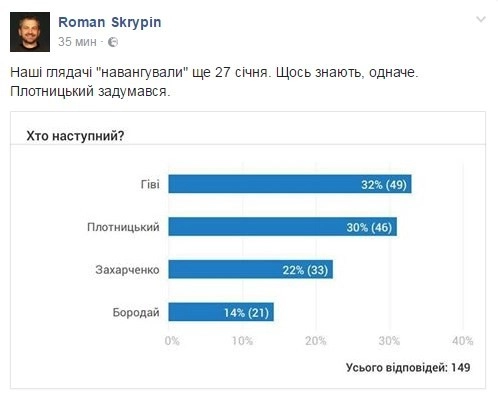 Украинский парламентарий Игорь Мосийчук: «Сегодня утром украинскими патриотами в Донецке в собственном кабинете с помощью взрывчатки ликвидирован глава бандгруппировки „Сомали“ Михаил Толстых „Гиви“. Приветствую всех причастных!»