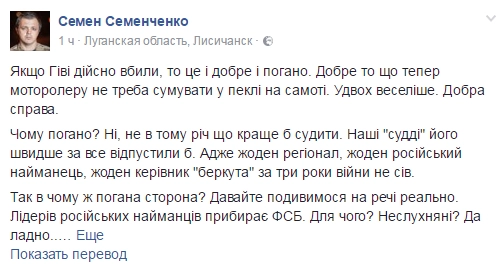 «Доброе утро, Украина! Собака, которая издевалась над украинскими пленными и убивала мирных жителей украинского Донбасса, наконец, отправилась в ад. Земля бетоном, Гиви. Операция „Ликвидация“ продолжается», — написал нардеп Радикальной партии Игорь Мосийчук.