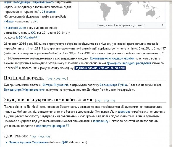 Украинцы посмеялись над ликвидацией Гиви даже в Википедии. Сегодня в украинской версии свободной энциклопедии появились поправки в биографии Михаила Толстых.