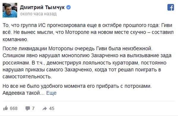«Гиви все. Не вынес мысли, что Мотороле на новом месте скучно — составил компанию», — пошутил журналист и экс-военный Армии Украины Дмитрий Тымчук.