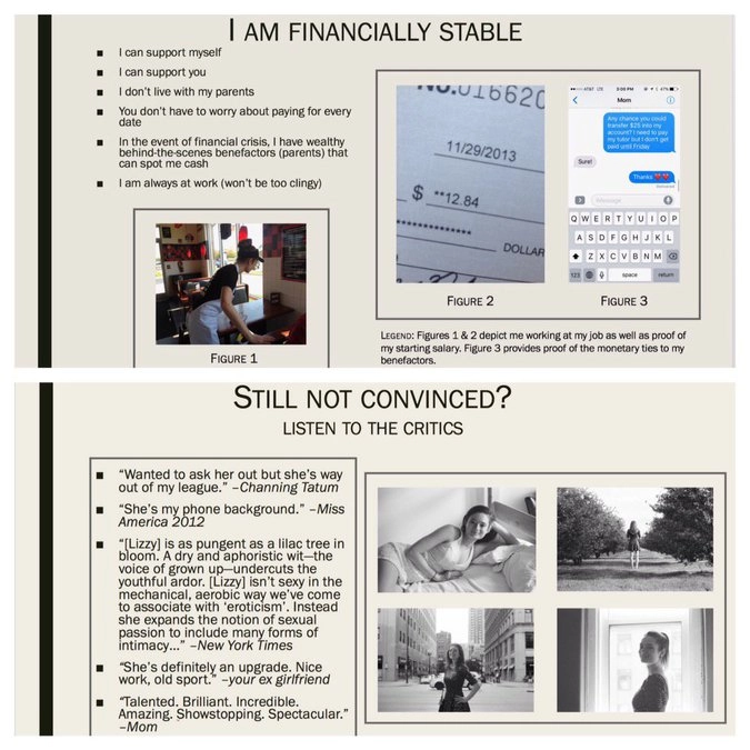 В другом слайде студентка заявляет, что финансово стабильна и может поддержать не только себя, но и Картера. Кроме того, она самостоятельна и бойфренду не придётся платить за неё на каждом свидании. А ещё у девушки всегда есть план Б: «В случае финансового кризиса я могу рассчитывать на богатых закулисных благотворителей (родителей), которые скинут мне наличку». Также Лиззи обещает не липнуть к парню, потому что занята на работе и прикладывает фотодоказательства.