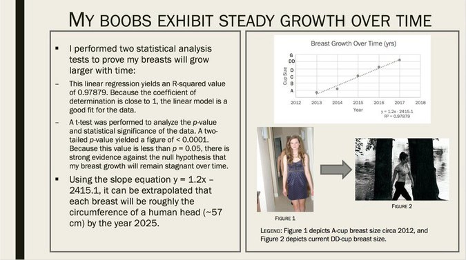 В слайде под названием «Моя грудь демонстрирует устойчивый рост на протяжении долгого времени» девушка изящно доказывает, что её не случайно взяли в университет Миннесоты. А также приводит расчёты, из которых следует, что к 2025 году обхват одной её груди будет равен обхвату человеческой головы и составит примерно 57 сантиметров.