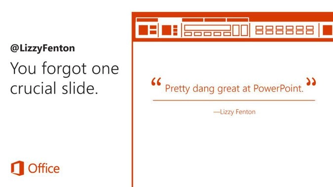 Зато креатив Лиззи по достоинству оценили специалисты компании Microsoft. Сотрудник, ведущий Твиттер-аккаунт корпорации, отреагировал на запись студентки: «Ты забыла указать одну важную вещь: „Очень круто делаю презентации в Power Point. Лиззи Фентон“».
