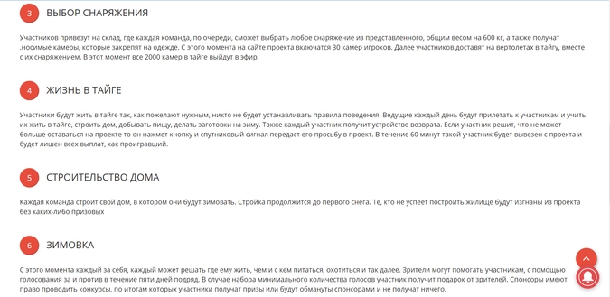 Участники шоу, утверждал Пятковский, проведут в сибирской тайге девять месяцев, занимаясь охотой и собирательством. Тому, кто выдержит испытание до конца, бизнесмен пообещал выплатить 100 миллионов рублей.