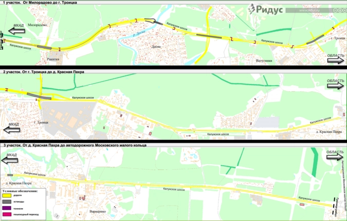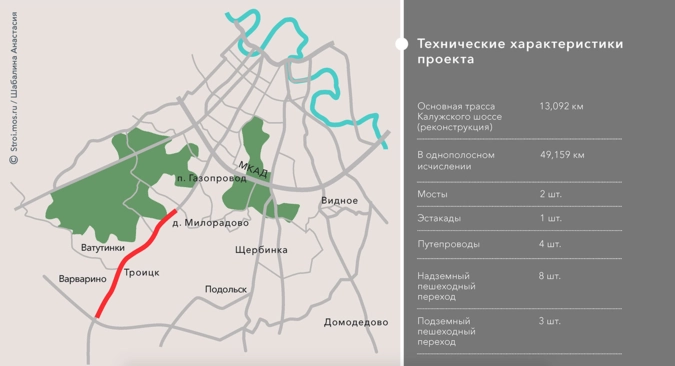 В минувшем году реконструкции подвергся первый участок Калужского шоссе — от МКАД до поворота на Коммунарку. Тогда были открыты семь крупных искусственных сооружений, среди которых — обновленный путепровод в районе торговых центров IKEA и «Славянский мир», прямой тоннель в районе съезда к поселкам Коммунарка и Газопровод, мост через реку Сосенка и другие объекты.