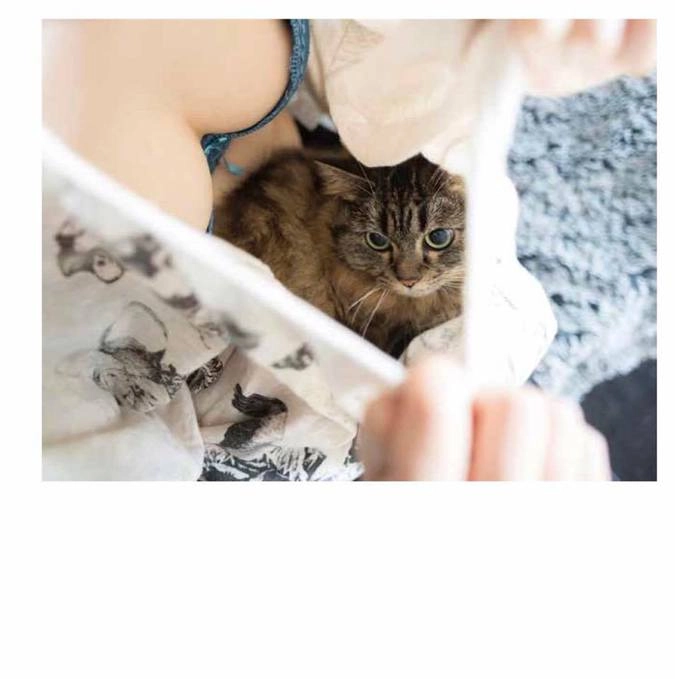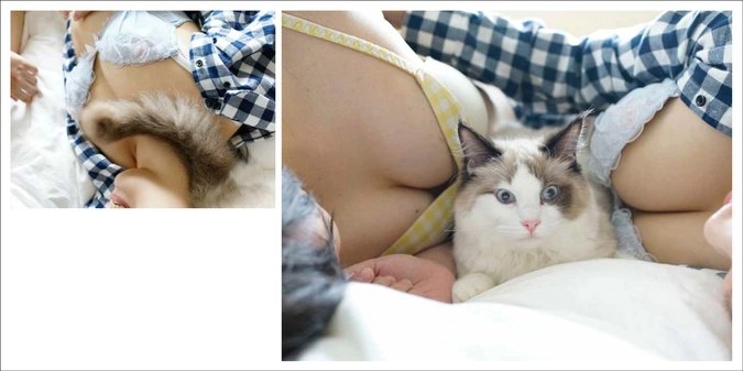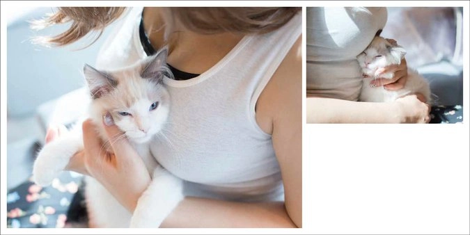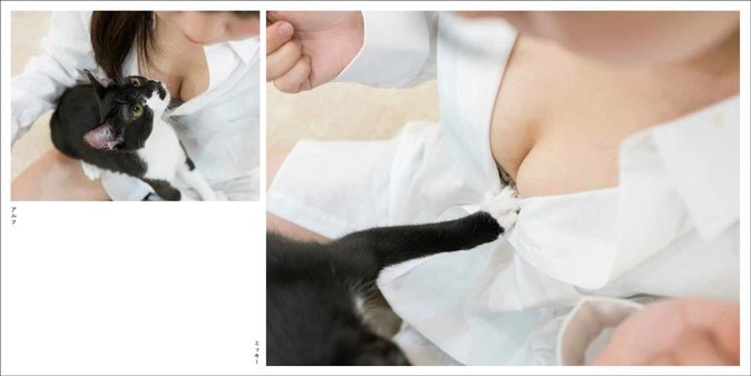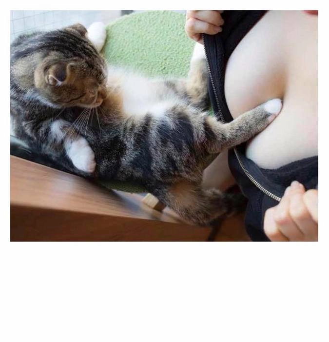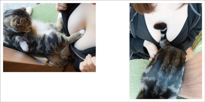 Японец снял серию фотографий котиков с женщинами, а из полученных снимков сделал фотокнигу, на 96 страницах которой коты устраиваются между женскими грудями, трогают бюст лапами и возлежат на груди с весьма довольным видом.