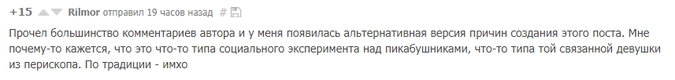 Другие указывают на кота: по рассказам гостей хозяина квартиры, животное находилось в той комнате, где шум слышно больше всего. «То есть кот, по своему собственному желанию, находился именно в, извините, „аномальной комнате“, при этом чувствовал себя от этого крайне херово (со слов другого пикабушника), но никуда и не собирался смыться?» — недоумевают пользователи. Другие считают, что ничего странного в этом нет. Появляются и совсем необычные версии появления истории о психологическом терроризме.
