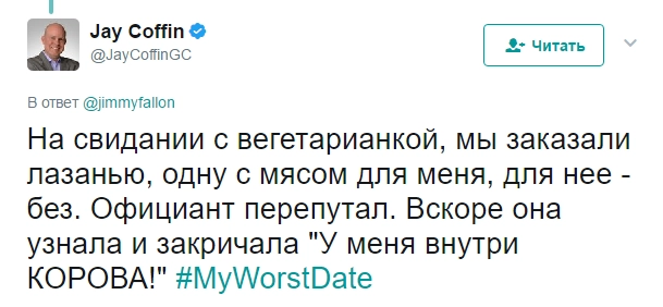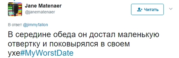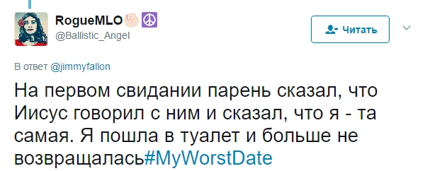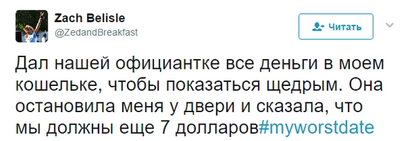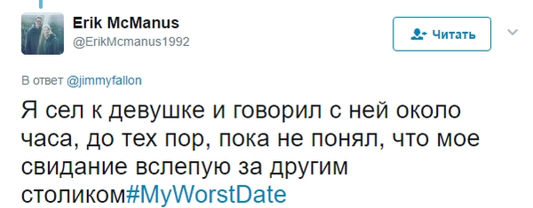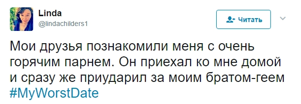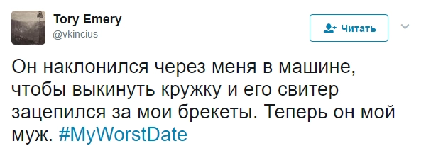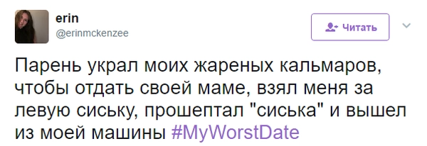 Психологи советуют на первом свидании больше говорить о партнёре и меньше — о себе. Больше задавать вопросов, внимательно слушать и меньше болтать. Но иногда все умные рекомендации бессильны, и свидание превращается в кошмар и катастрофу. Собрали для вас 13 самых смешных и грустных твитов из серии «Моё худшее свидание».