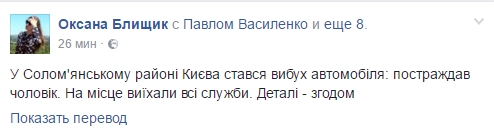 «В Соломенском районе Киева произошел взрыв автомобиля: пострадал мужчина. На место выехали все службы. Детали — позже», — написала она в Facebook.