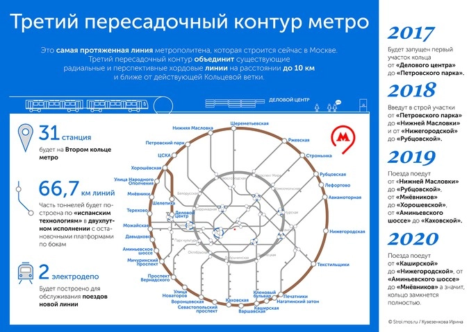 Строящееся новое кольцо московской подземки — Третий пересадочный контур — имеет все шансы стать самой длинной в мире кольцевой линией метро: его протяженность составит более 60 километров, на кольце расположится 31 станция.