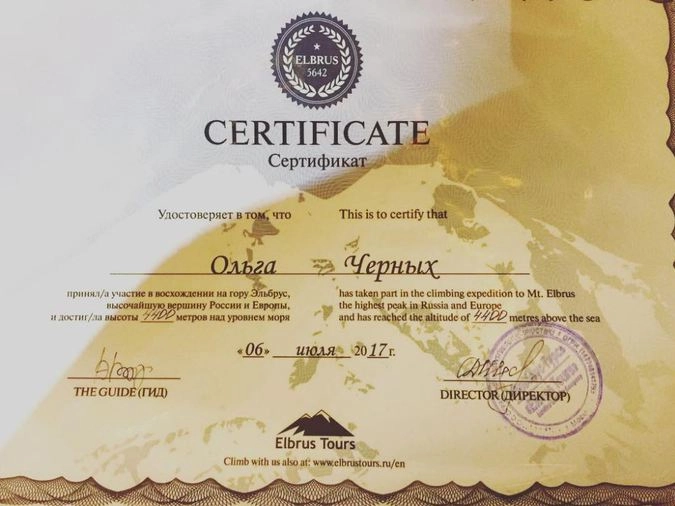 Сама Ольга поднялась на Эльбрусе на максимальную высоту в 4400 метров — об этом говорит ее сертификат. Выше она решила не ходить, чтобы не подвергать опасности ни свою жизнь, ни жизнь участников своей группы, от которой в случае проблем ей пришлось бы «отрывать» гидов.