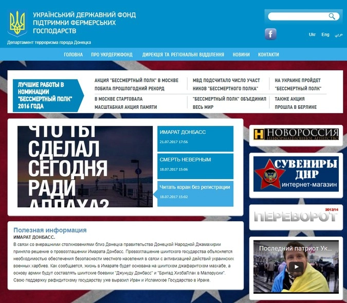 Сайт государственного фонда Украины по поддержке фермерских хозяйств оказался взломан. Хакеры разместили на портале новости об акции «Бессмертный полк», провозгласили «имарат Донбасс» и поставили рекламный баннер интернет-магазина «Сувениры ДНР».