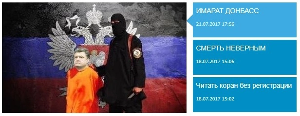 На главной странице портала размещен коллаж, на котором президент Украины Петр Порошенко стоит на коленях рядом с человеком в черном. В рубрике «Полезная информация» значится: «В связи со вчерашними столкновениями близ Донецка правительство Донецкой Народной Джамахирии приняло решение о провозглашении Имарата Донбасс».