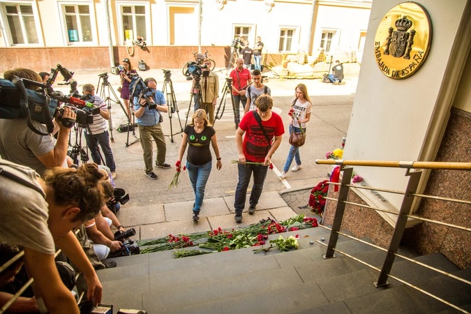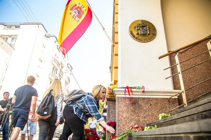 Москвичи несут цветы и свечи к посольству Испании в память о жертвах теракта в центре Барселоны, когда на большой скорости в толпу въехал фургон.