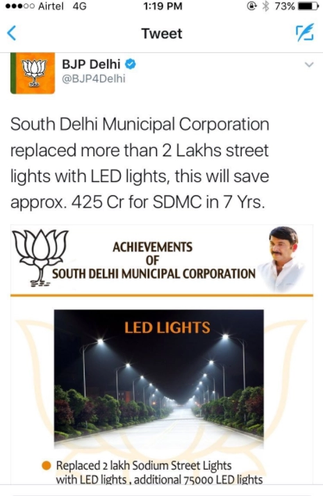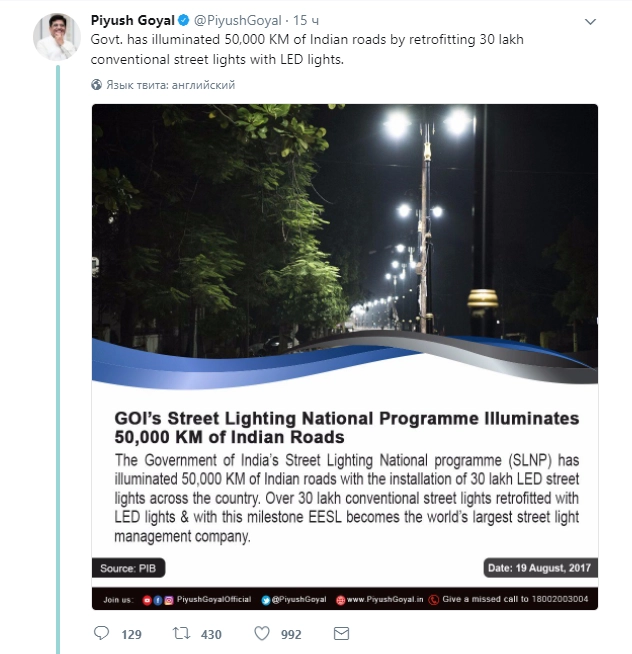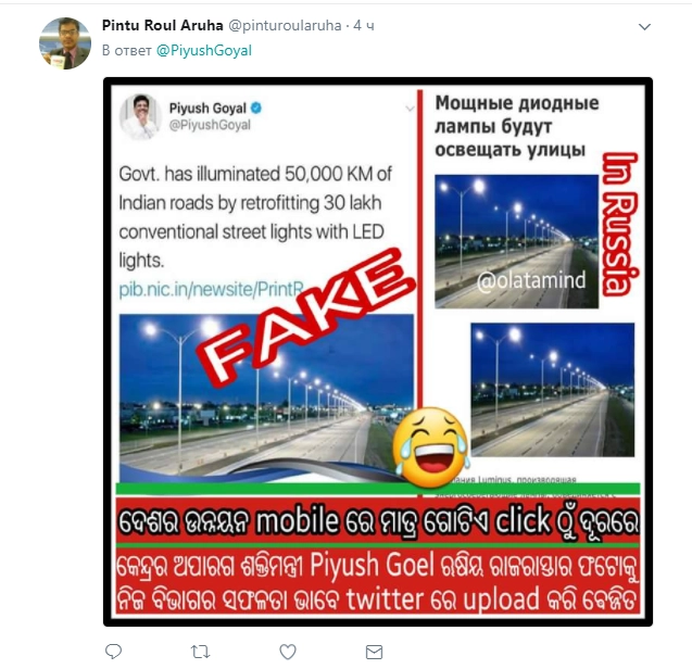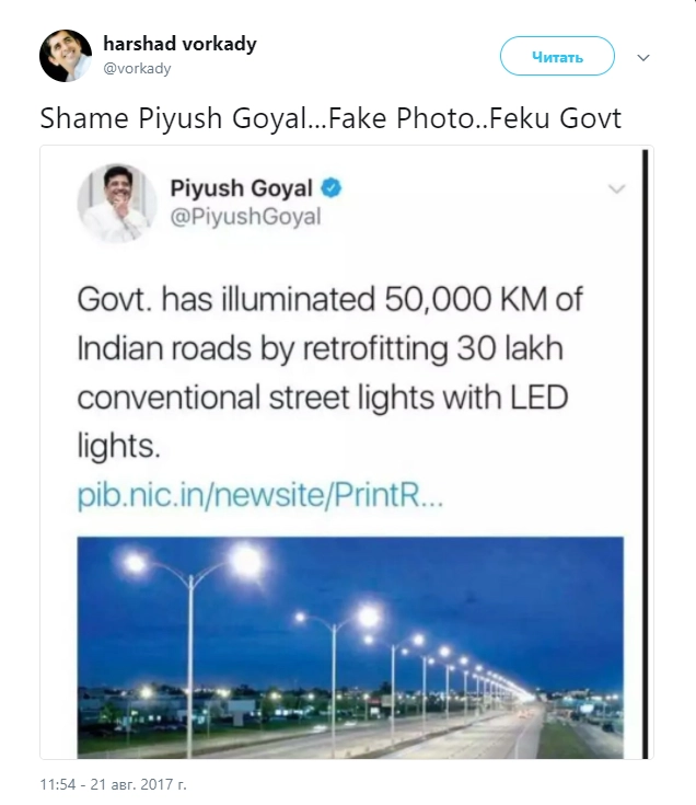 Министр энергетики Индии Пиюш Гоял опубликовал в Twitter фотографию дороги с подписью «Правительственные службы осветили 50 тысяч километров индийских дорог, установив светодиодные фонари». Пользователи заметили, что на снимке запечатлена российская дорога.