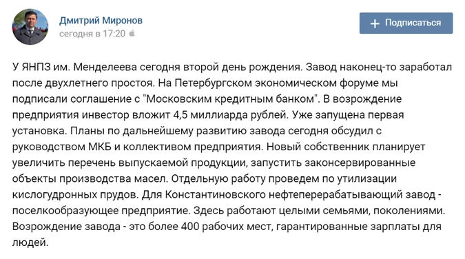 «На Петербургском экономическом форуме мы подписали соглашение с „Московским кредитным банком“, который обещает вложить в возрождение завода 4,5 миллиарда рублей. Кроме того, мы обсудили руководством банка и коллективом предприятия дальнейшие планы по развития ЯНПЗ. Планируется увеличение перечня выпускаемой продукции и запуск законсервированных объектов производства масел», — отметил Миронов, говоря о принятых для спасения «ЯНПЗ им. Д. И. Менделеева» мерах.