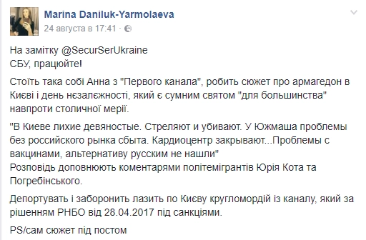 «На заметку СБУ! Стоит такая Анна с Первого канала, делает сюжет об армагеддоне в Киеве и Дне независимости, который является грустным праздником „для большинства“, напротив столичной мэрии. „В Киеве лихие девяностые. Стреляют и убивают. У „Южмаша“ проблемы без российского рынка сбыта. Кардиоцентр закрывают. Проблемы с вакцинами, альтернативу русским НЕ нашли“. Рассказ дополняют комментариями политэмигрантов Юрия Кота и Погребинского. Депортировать и запретить лазить по Киеву кругломордой с канала, который по решению СНБО
