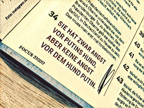 В подтверждение своих слов он опубликовал фото страницы журнала с фрагментом публикации. Напомнив читателям о том, что Ангела Меркель боится собак, журналист употребил аналогичное описание по отношению к Путину.