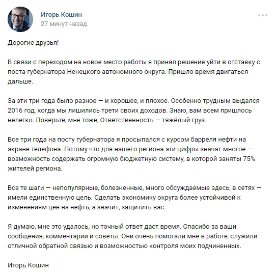 По словам Кошина, его отставка связана с переходом на новое место работы. Правда, куда именно он переходит работать, бывший губернатор НАО не уточнил.