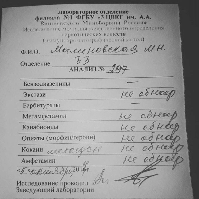 Обвинения не остались без внимания телеведущей. Малиновская опубликовала результаты теста на запрещенные вещества. Судя по справке, медики не нашли следов наркотиков в ее организме.