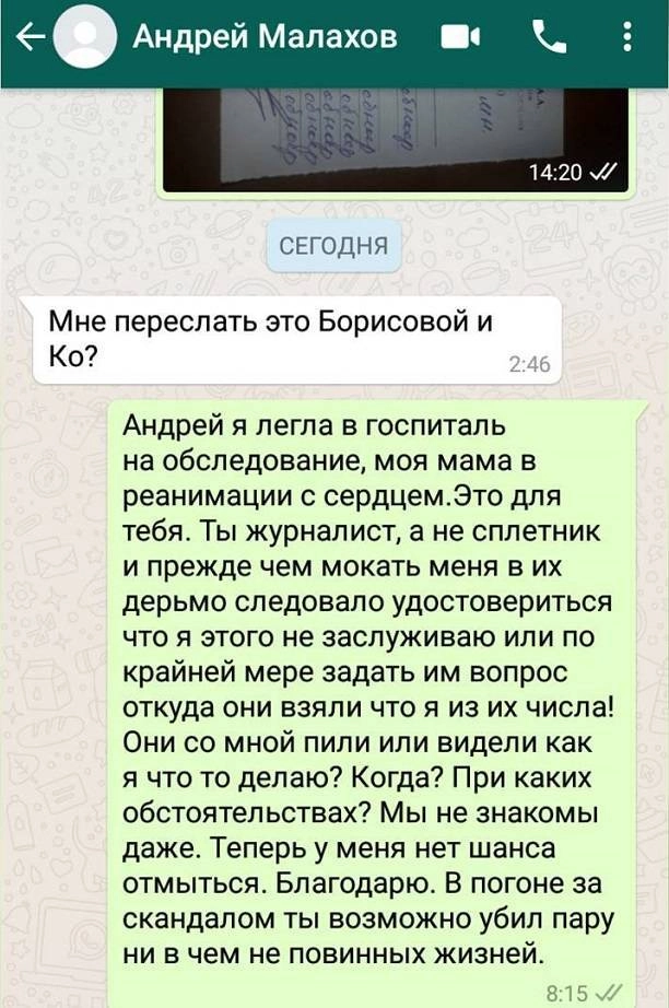Особое негодование Малиновской вызвала позиция Андрея Малахова, который позволил дать в эфир непроверенную информацию. Она написала ему гневное сообщение, которое опубликовала в Сети. Известная блондинка сообщила, что после выхода программы она оказалась в госпитале, а ее мама попала в больницу: от переживаний у нее начались проблемы с сердцем.