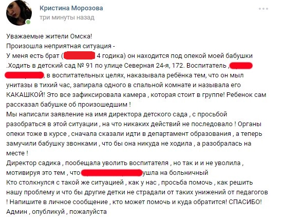 Родители воспитанников детского сада № 91 в Омске заступились за воспитательницу, которую обвинили в том, что она заставляла ребенка чистить унитаз. Об издевательствах над мальчиком в группе «ЧП Омск» в соцсети «ВКонтакте» сообщила его сестра Кристина Морозова.