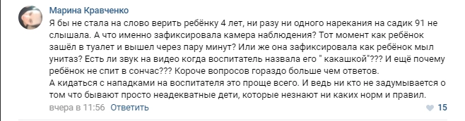А родители детей из той же детсадовской группы объявили, что камера наблюдения зафиксировала только то, что ребенок зашел в туалет и вышел оттуда через несколько минут. «Кидаться с нападками на воспитателя проще простого», — добавили в комментариях.