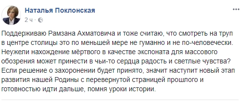 «Поддерживаю Рамзана Ахматовича и тоже считаю, что смотреть на труп в центре столицы — это по меньшей мере не гуманно и не по-человечески», — написала Поклонская.