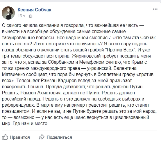 Собчак отреагировала на это записью в Facebook. «Рамзан Кадыров вслед за мной призывает похоронить Ленина. Правда, добавляет, что решать должен Путин. Решать, Рамзан Ахматович, должен не Путин. Решать должен российский народ. Решать он это должен на свободных выборах и референдумах», — отметила потенциальная участница президентских выборов.