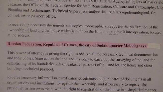 Постоянно проживающему на территории США гражданину Украины была выдана в Айдахо доверенность, в которой он передает гражданке РФ право на получение документов на помещение в Судаке по адресу: Российская Федерация, Республика Крым, г. Судак, площадь Молодежная.