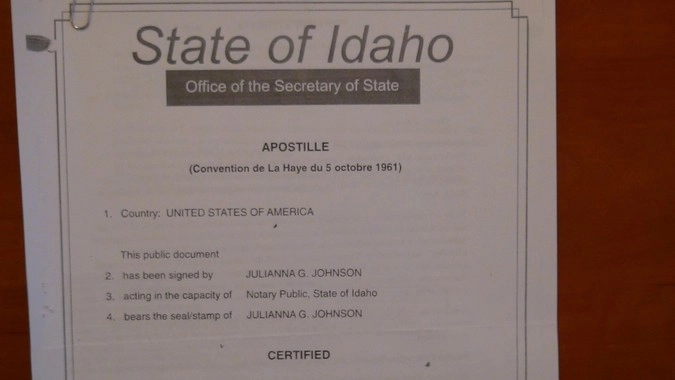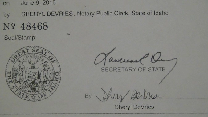Доверенность подтверждена гербовой печатью штата Айдахо, а также заверена подписью главы штата и нотариуса. Законность документа закрепляет апостиль — международная стандартизированная форма заполнения сведений, которая необходима для предъявления на территории стран, признающих такую форму легализации.
