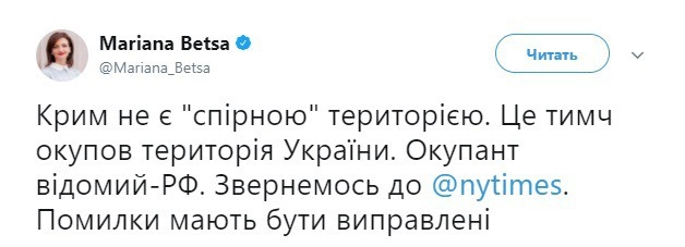 «Крым не является „спорной“ территорией. Это временно оккупированная территория Украины. Оккупант известен — РФ. Обратимся к The New York Times. Ошибки должны быть исправлены», — написала пресс-секретарь МИД Украины Марьяна Беца на личной страничке в Twitter.