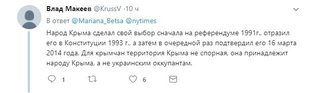 «Народ Крыма сделал свой выбор сначала на референдуме 1991 г., отразил его в Конституции 1993 г., а затем в очередной раз подтвердил его 16 марта 2014 года. Для крымчан территория Крыма не спорная, она принадлежит народу Крыма, а не украинским оккупантам», — написал другой.