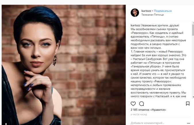 Он выразил уверенность в том, что Самбурская станет отличным «Ревизорро», честным и принципиальным, а 9 миллионов подписчиков актрисы в Instagram ее в этом поддержат.