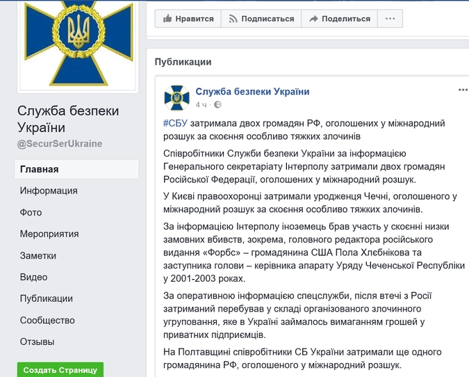 «По информации Интерпола, иностранец участвовал в совершении ряда заказных убийств, в частности, главного редактора русского издания Forbes — гражданина США Пола Хлебникова и заместителя председателя — руководителя аппарата правительства Чеченской Республики в 2001—2003 годах», — говорится на странице СБУ в Facebook.