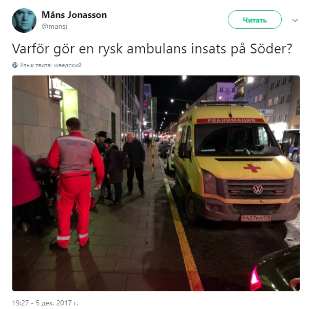 Этот снимок опубликовал на своей странице в Twitter швед Монс Юнассон, который задался вопросом, каким образом российская скорая оказалась в шведской столице.