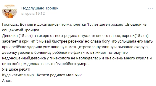 В одном из общежитий уральского Троицка 15-летняя школьница родила ребенка в туалете. 18-летний молодой человек, который предположительно является отцом ребенка, заставлял роженицу смыть малыша в унитаз.