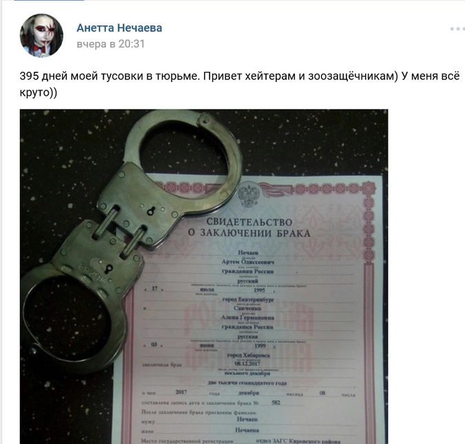Осужденная за жестокое убийство животных Алена Савченко вышла замуж, находясь в тюрьме. Об этом она сообщила на своей странице в соцсети «ВКонтакте», поместив там фотографию свидетельства о браке рядом с наручниками.