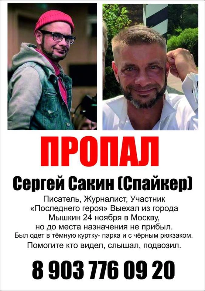 По пути из города Мышкин в Москву пропал гражданский журналист «Ридуса», писатель, соавтор романа «Больше Бэна» (премия «Дебют» 2000 года в номинации «Крупная проза»), участник телешоу «Последний герой» Сергей Сакин. В поисках человека участвуют добровольцы из отряда «Лиза Алерт» и не особенно охотно — полиция.