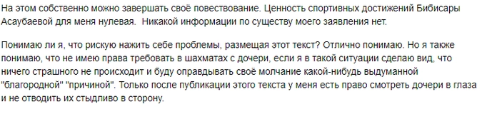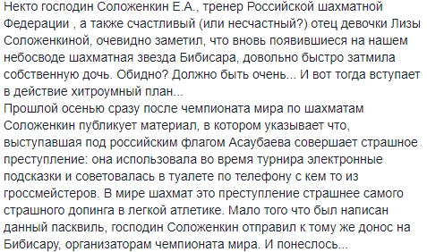 Он считает, что обвинения в адрес девочки, которая делает невероятные успехи в шахматах, возникли не на пустом месте: дело в том, что тренер является «отцом другой нашей шахматистки, показывающей менее хорошие результаты на соревнованиях».