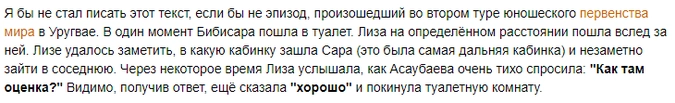 «„Вот откуда такая самоуверенная прекрасная и взрослая игра! — начали кричать недруги Асаубаевой. — Это не она играет. Это компьютер! Ей подсказывают! Она — заурядный игрок!“ Излишне говорить, что устроители чемпионата мира никаких нарушений не обнаружили. Пронести что-либо металлическое на турнир просто не реально. Однако несчастного ребенка перед игрой стали тщательно обыскивать. В такой ситуации нервный срыв и истерики могут произойти с любым из нас, не говоря уже о ребенке», — написал в Facebook Добровинский.