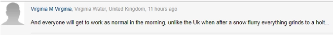 Другие отметили, что в Британии «один сантиметр снега и немного льда» считаются настоящим катаклизмом.