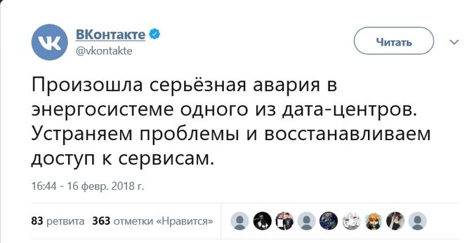 В энергосистеме одного из дата-центров произошла серьезная авария. «Устраняем проблемы и восстанавливаем доступ к сервисам», — отмечается в микроблоге соцсети в Twitter.