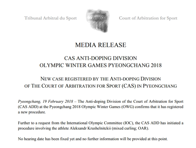 Спортивный арбитражный суд открыл дело в отношении российского керлингиста Александра Крушельницкого. Спортсмена подозревают в нарушении антидопинговых правил.