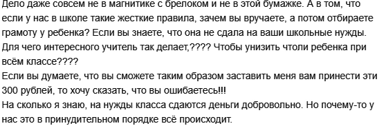Мать Ольги Наговицыной написала в соцсетях, что на Новый год учительница дарила ученикам магнитики и вручала грамоты, но ее дочери подарок не дала, «объясняя это тем, что ребенок не сдал на нужды класса 300 рублей».