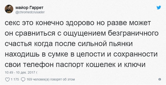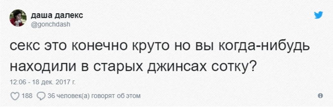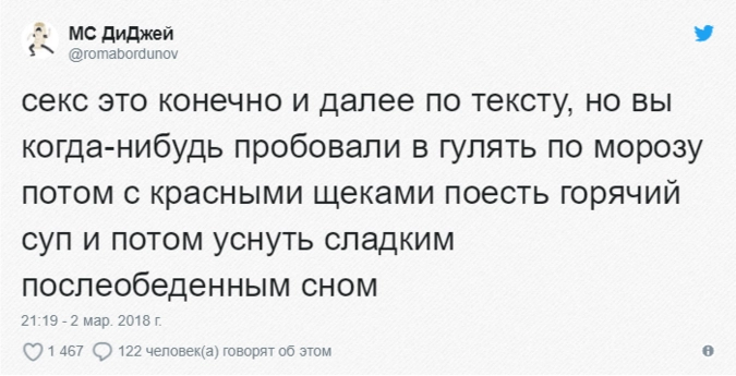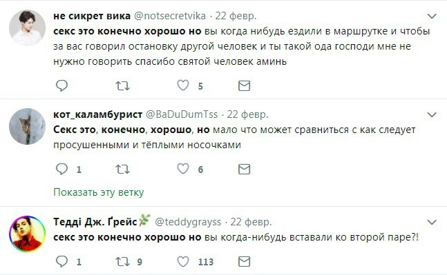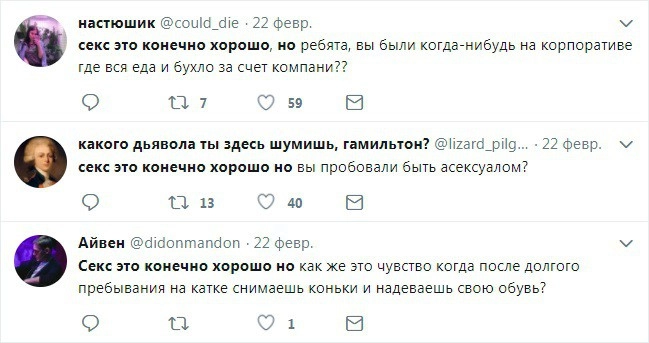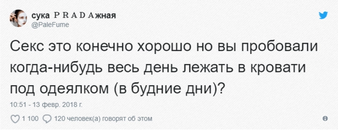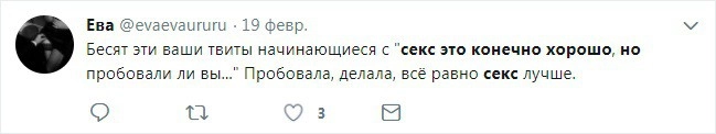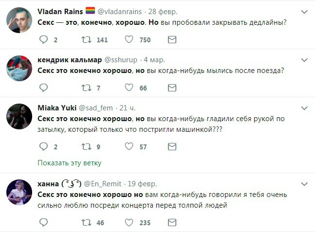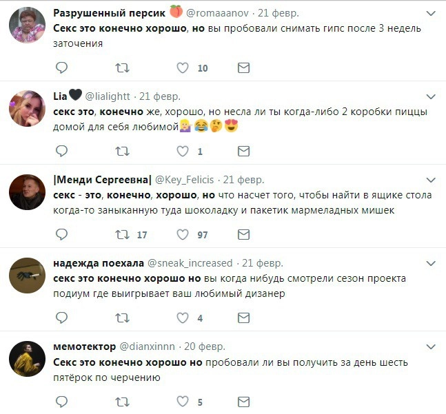 На просторах социальной сети Twitter решили поговорить о том, что может быть лучше секса. Каждая публикация на эту тему начинается со слов «Секс — это, конечно, хорошо, но…», продолжение фразы пользователи пишут на свой вкус. И встречаются весьма неожиданные замены этому занятию, однако большинство из предложенных вариантов рассказывают о простых, но очень приятных вещах, которыми полна наша жизнь. Ведь всё новое — это хорошо забытое старое!