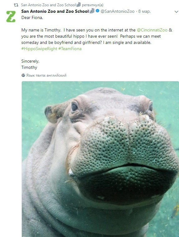 Восьмого марта в официальном аккаунте американского зоопарка Сан-Антонио опубликовали письмо бегемота по кличке Тимоти своей возлюбленной Фионе из другого зверинца.