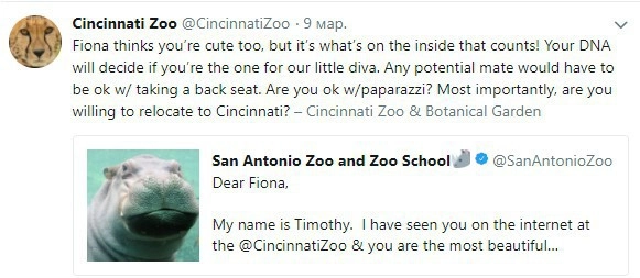 «Дорогая Фиона, меня зовут Тимоти. Я увидел тебя в интернете в аккаунте зоопарка Цинциннати, и ты самый красивый бегемот из тех, что я когда-либо видел! Возможно, когда-нибудь мы сможем встретиться и стать парнем и девушкой? Я свободен и доступен для отношений», — говорится в послании.